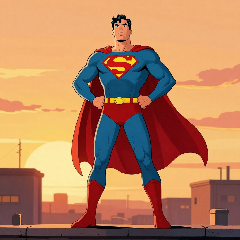 A quintessential superhero standing for justice, ready to save the day. Character appearance will match the reference image while maintaining the chosen art style.