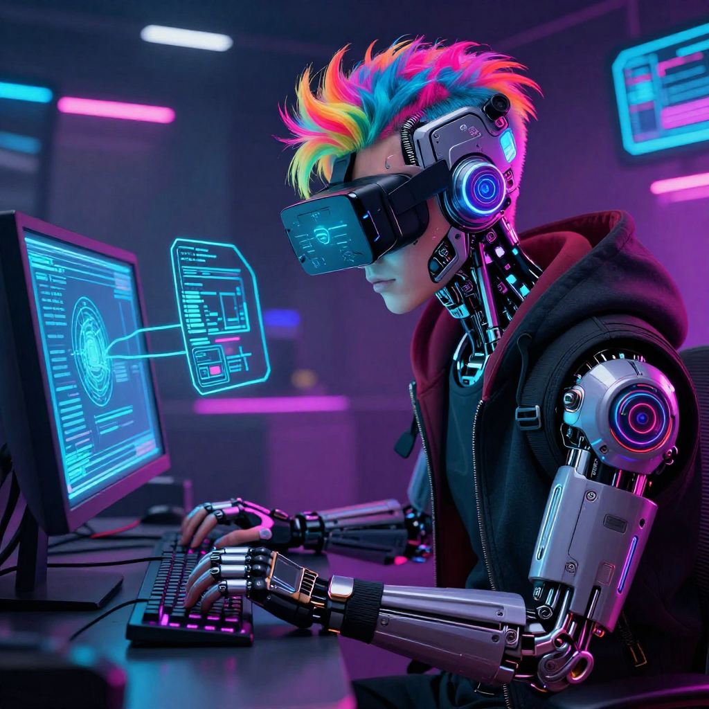 A digital expert navigating the neon-lit cyber world. Character appearance will match the reference image while maintaining the chosen art style.