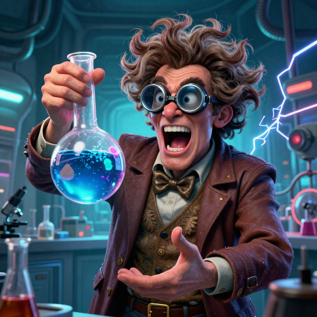 A brilliant but unhinged inventor with dangerous experiments. Character appearance will match the reference image while maintaining the chosen art style.