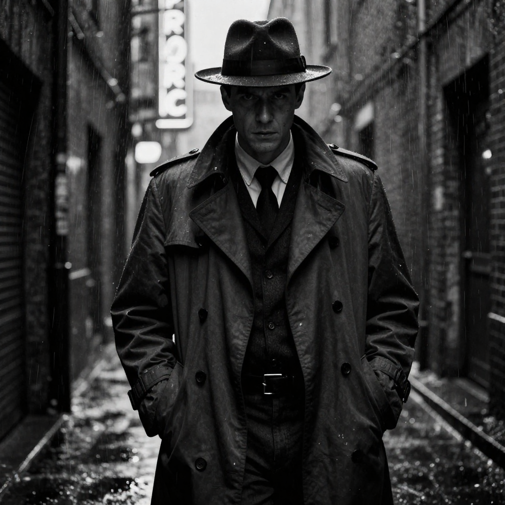 A gritty investigator solving crimes in a monochrome city. Character appearance will match the reference image while maintaining the chosen art style.