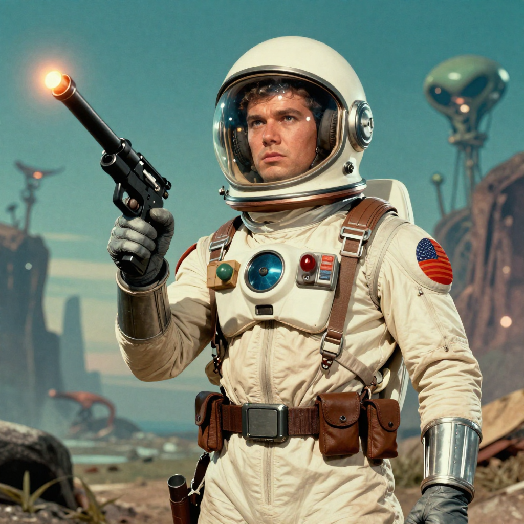 A retro-futuristic hero exploring the outer limits of space. Character appearance will match the reference image while maintaining the chosen art style.